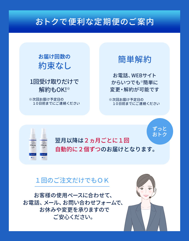 - 定期コースといっても購入回数の縛りはありません。お電話1本でお休み・変更・解約を承ります。次回お届け予定日の10日前までにご連絡ください。