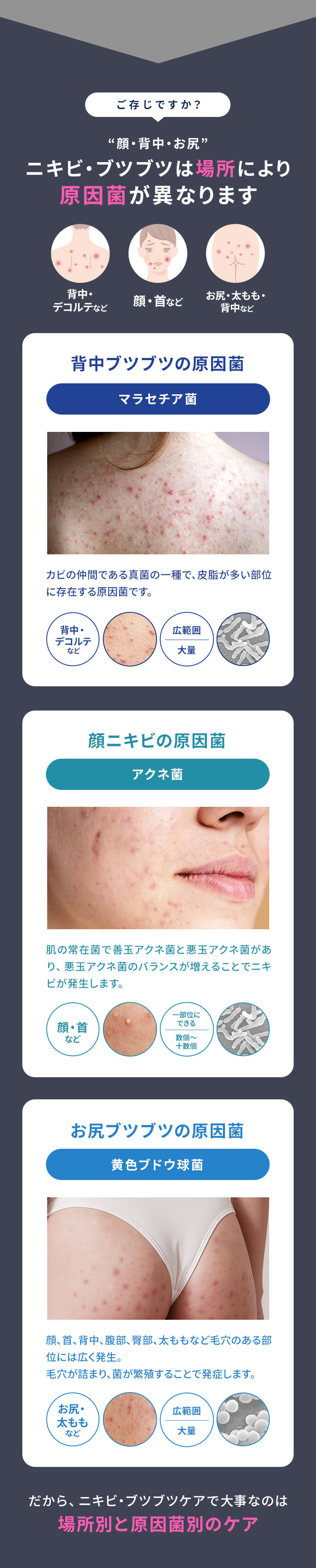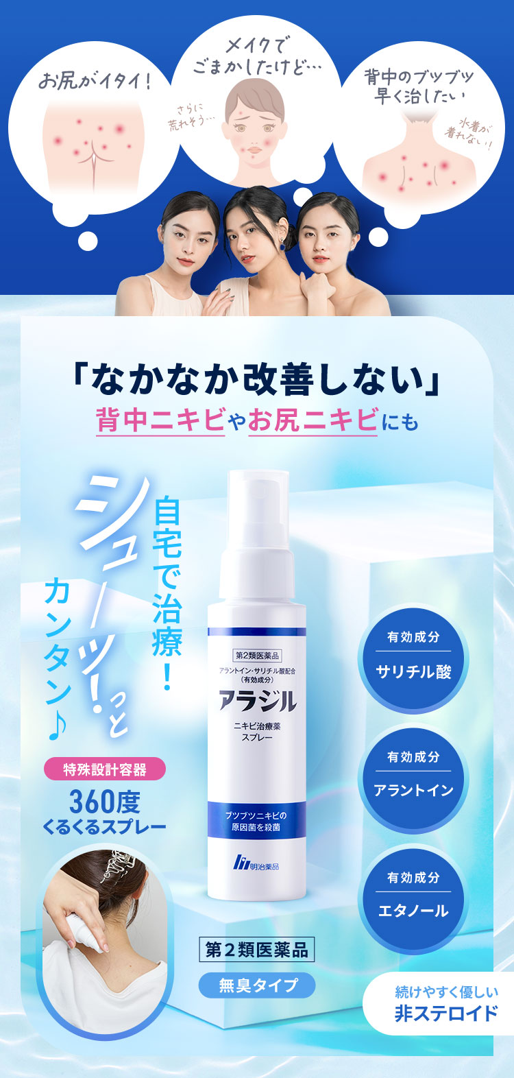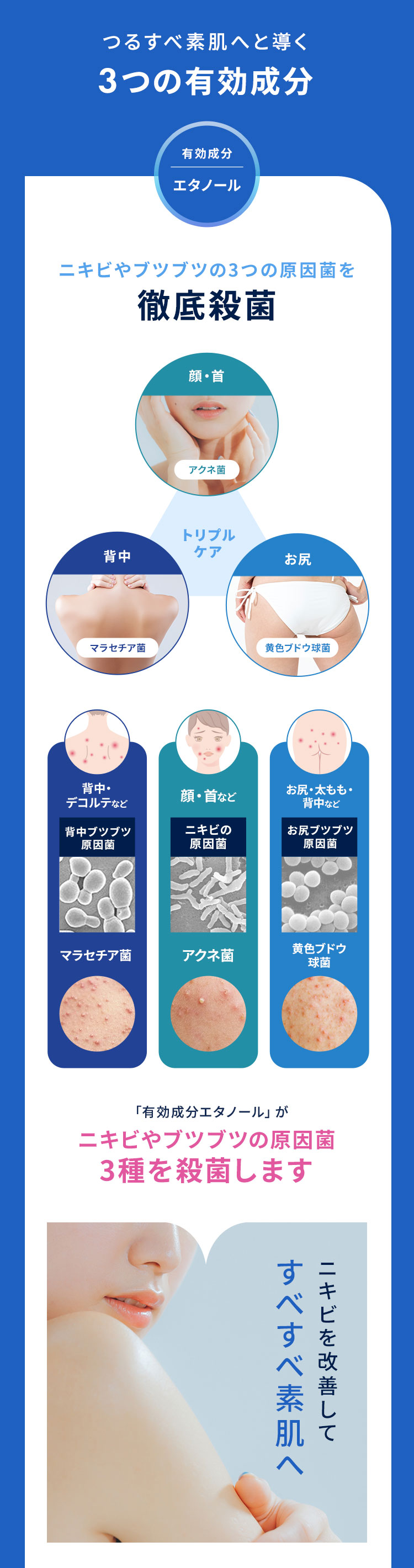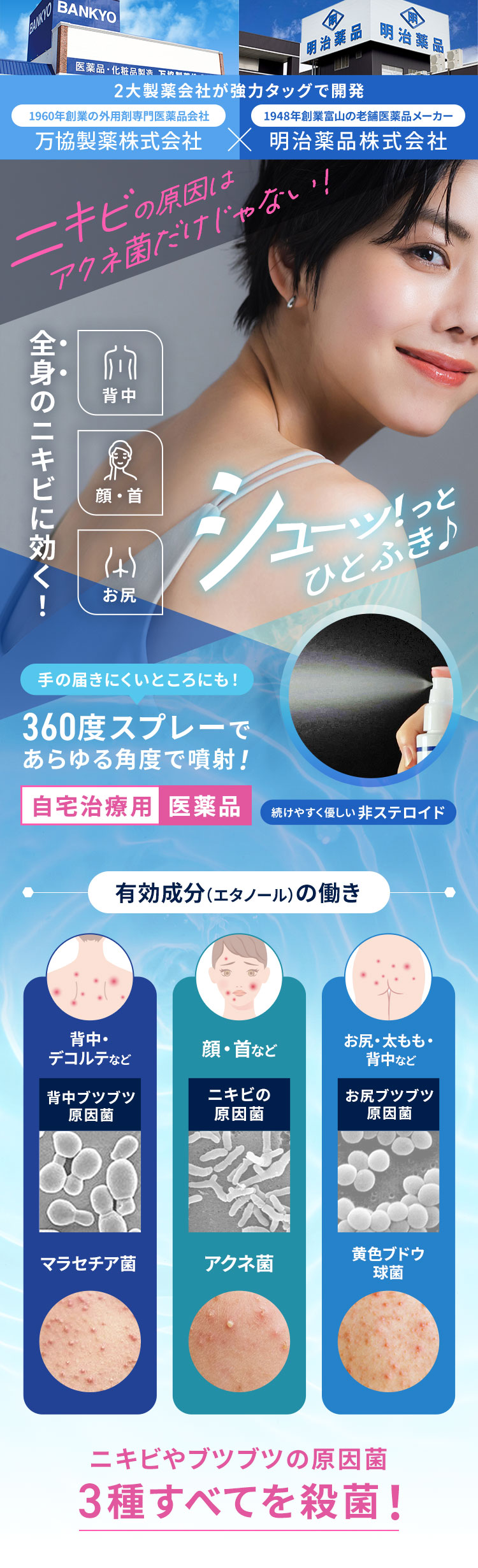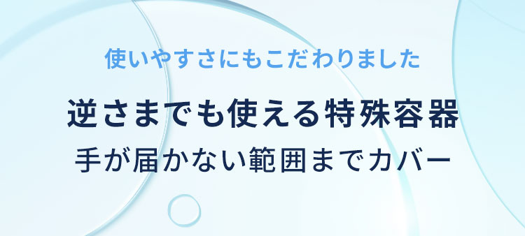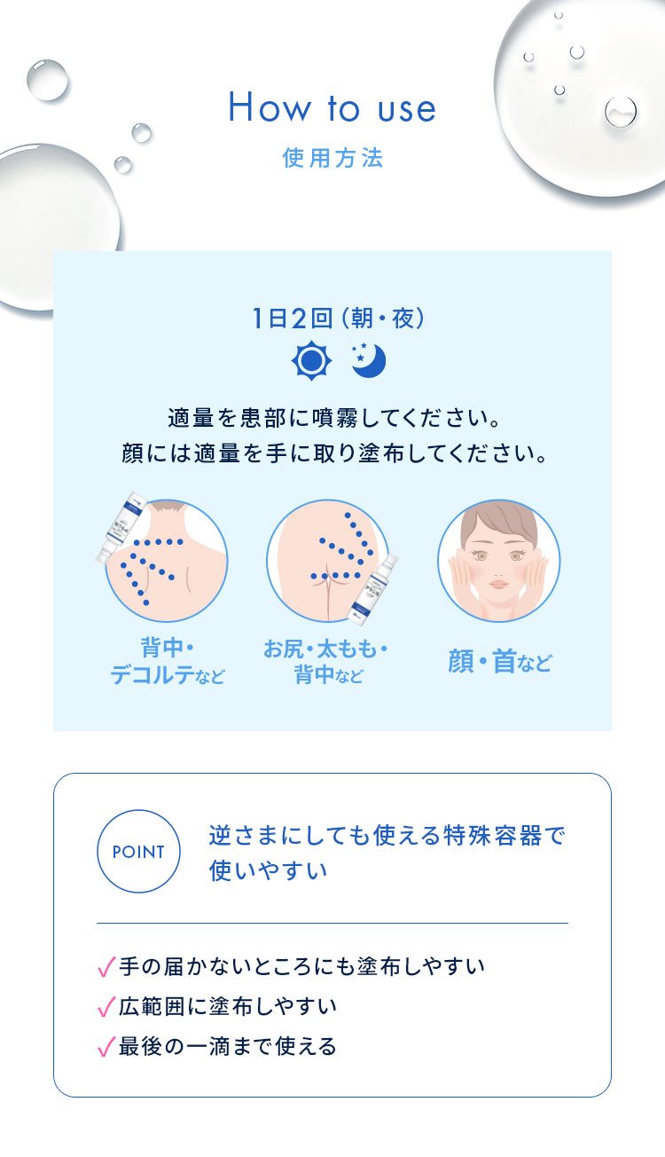 - 3つの有効成分配合、背中やお尻などのニキビに使いやすいスプレータイプ。広範囲に塗布しやすく逆さまにしても使える特殊容器で、手の届きくい部位のニキビにも効きます。