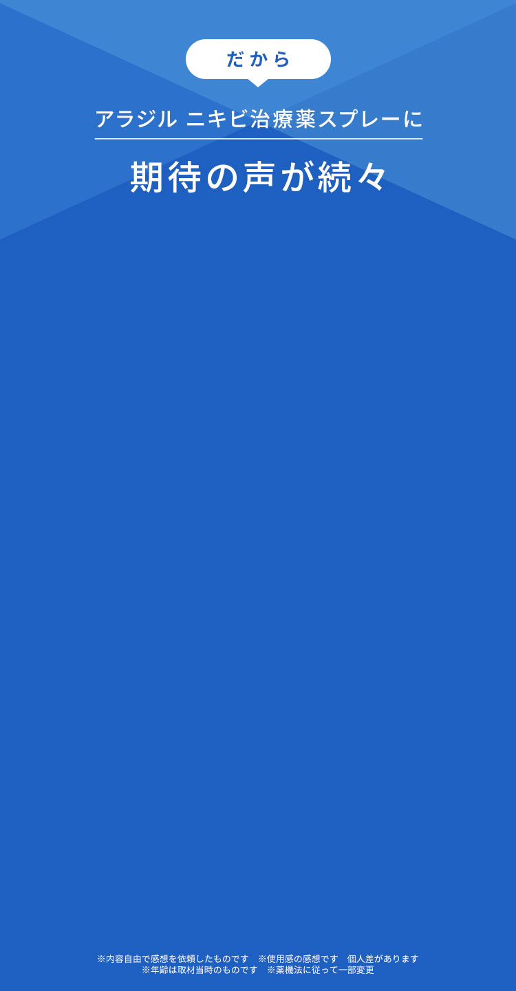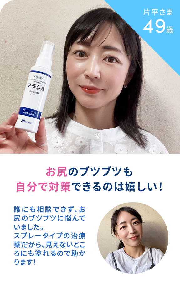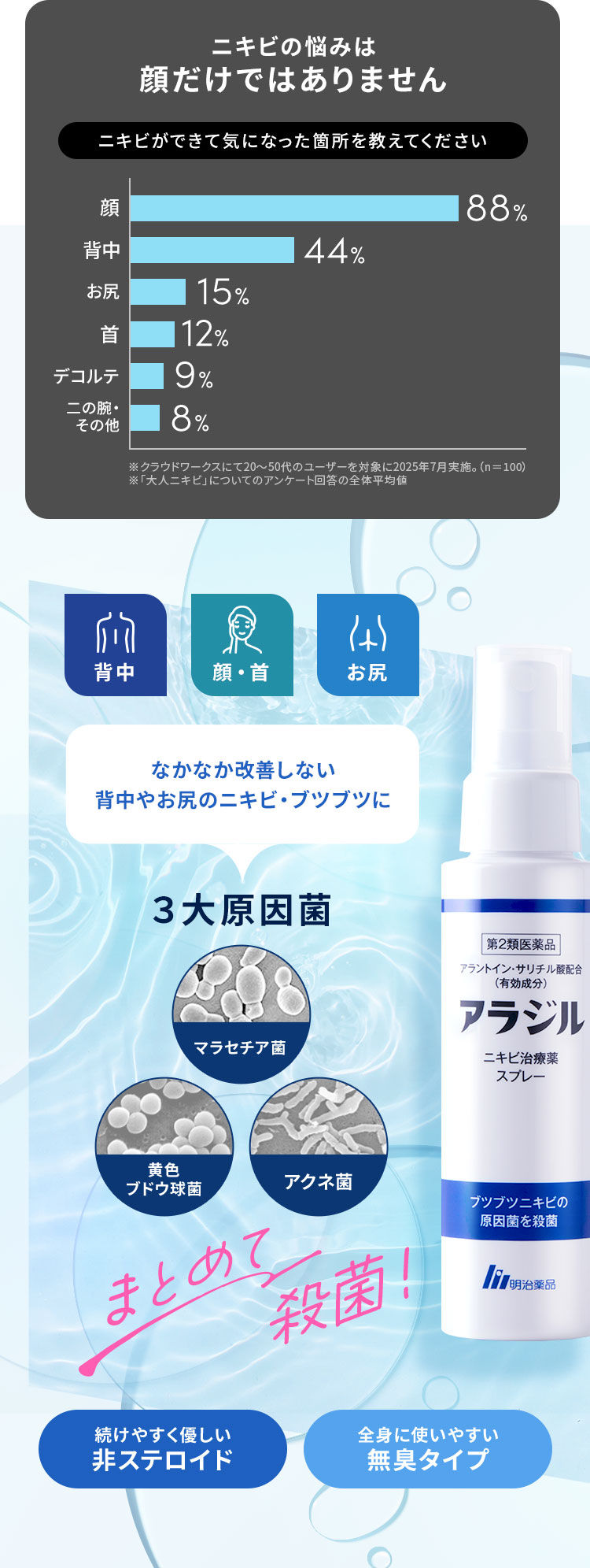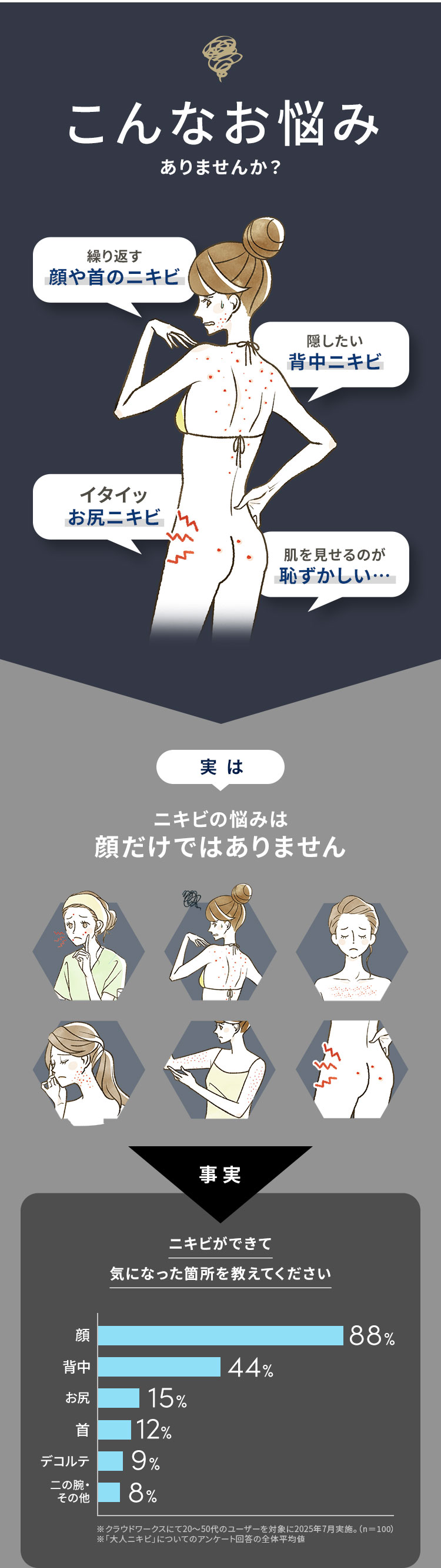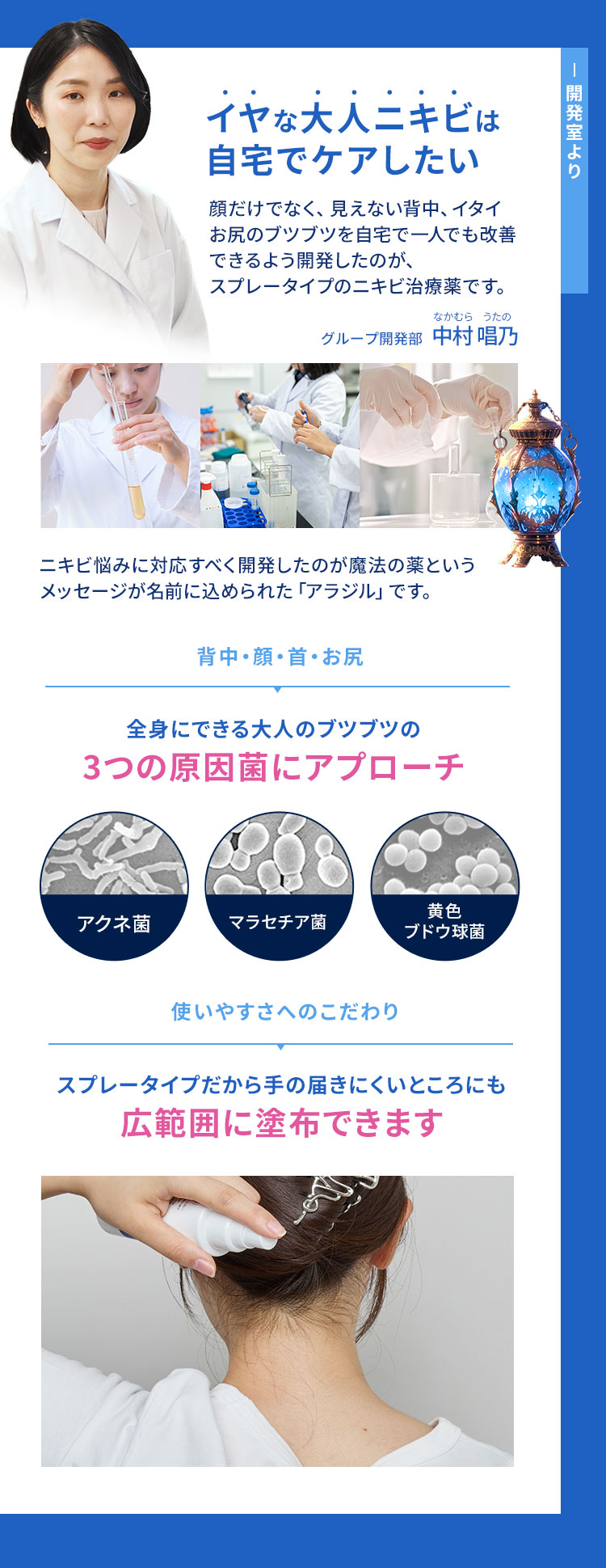 - 3つの有効成分配合、背中やお尻などのニキビに使いやすいスプレータイプ。広範囲に塗布しやすく逆さまにしても使える特殊容器で、手の届きくい部位のニキビにも効きます。