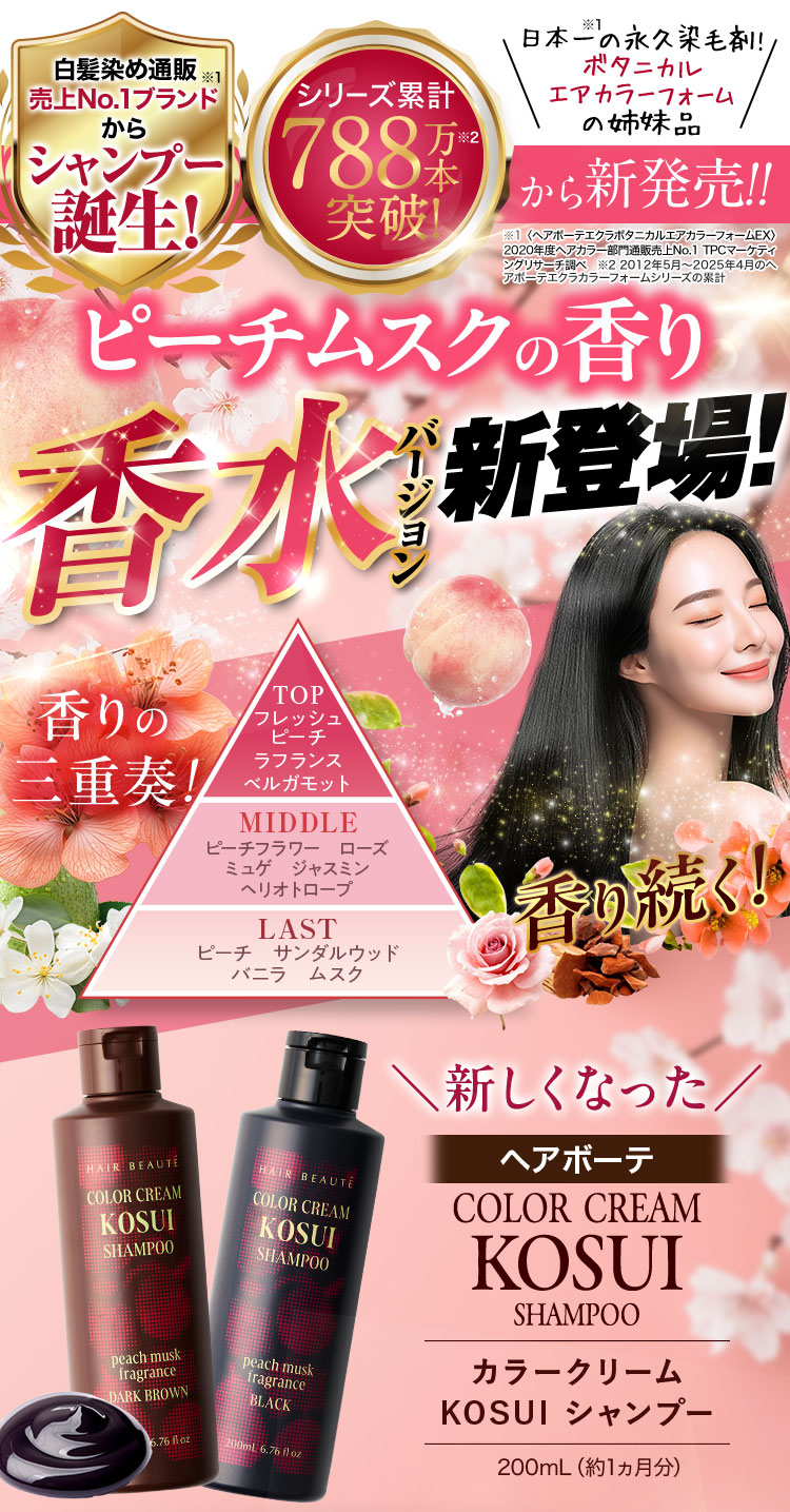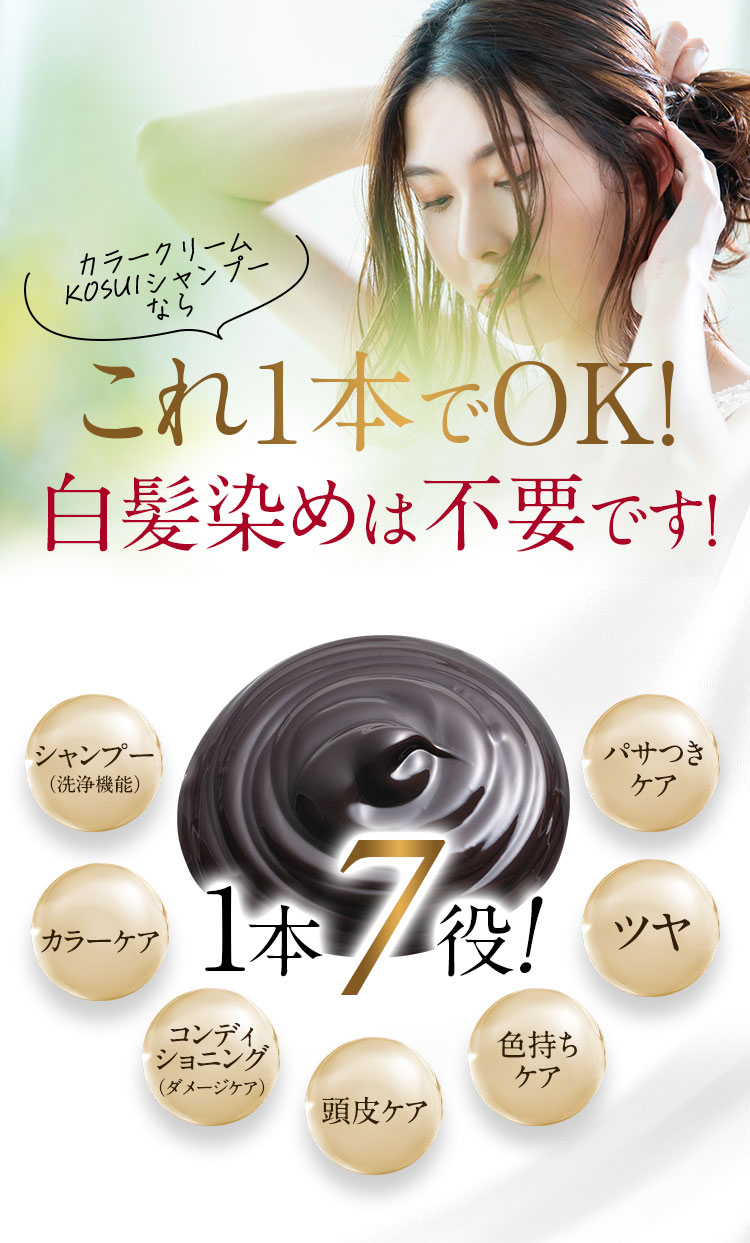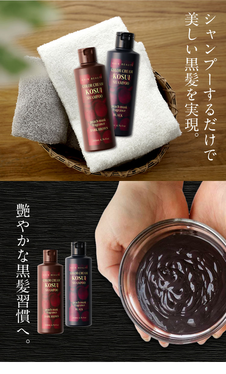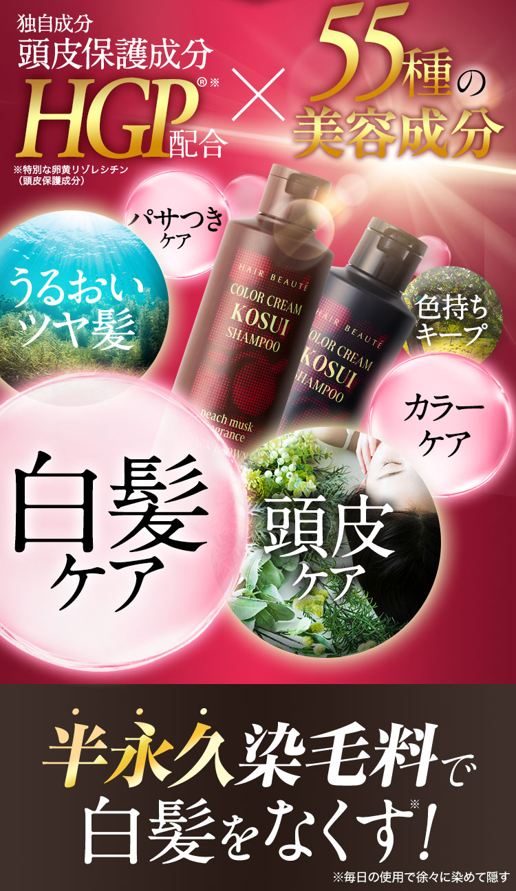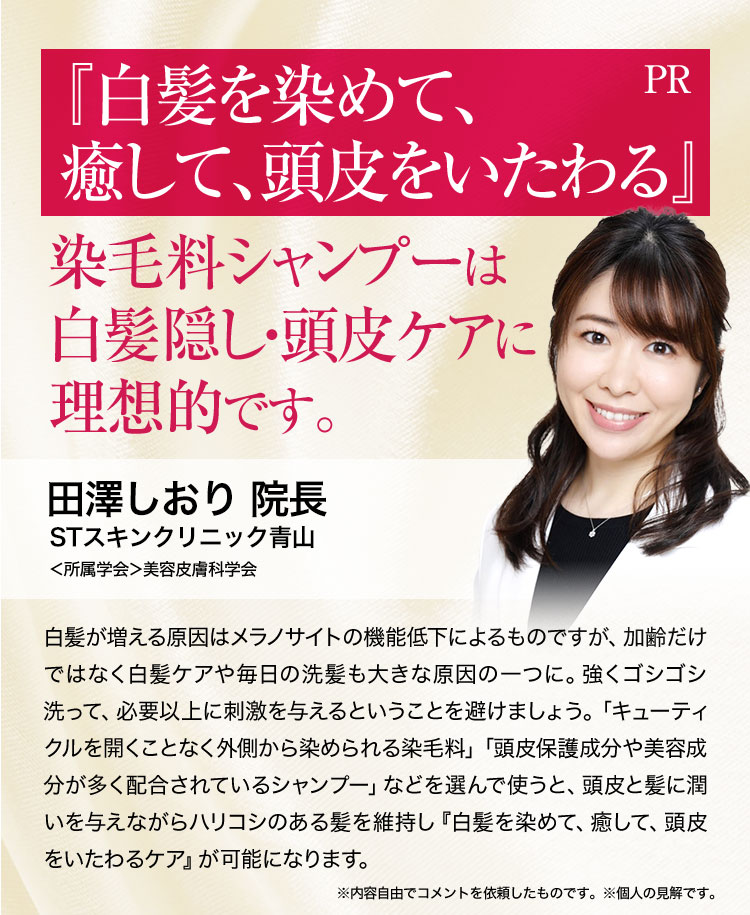 - 水、BG、グリセリン、ソルビトール、尿素、水添ナタネ油アルコール、PPG-1/PEG-1ステアラミン、エチルヘキサン酸セチル、グリシン、リゾレシチン、ミツイシコンブエキス、環状リゾホスファチジン酸Na、加水分解卵黄、 アセチルヘキサペプチド-1、ラリックスエウロパエア木エキス、アセチルチロシン、チャ葉エキス、フィトスフィンゴシン、ザイモモナス培養エキス、ハチミツエキス、卵殻、炭、グリチルリチン酸2K、卵殻膜、アセチルヒアルロン酸Na、 加水分解ヒアルロン酸、ヒアルロン酸ヒドロキシプロピルトリモニウム、加水分解コラーゲン、水溶性コラーゲン、サクシノイルアテロコラーゲン、加水分解シルク、ハチミツ、加水分解コンキオリンタンパク、セイヨウヤブイチゴ葉エキス、 ココイル加水分解コラーゲンK、(加水分解シルク/PGプロピルメチルシランジオール)クロスポリマー、ポリクオタニウム-61、ポリクオタニウム-47、センブリエキス、ビワ葉エキス、オウゴン根エキス、ノイバラ果実エキス、 シャクヤク根エキス、マグワ根皮エキス、トウキ根エキス、クララ根エキス、アカヤジオウ根エキス、オタネニンジン根エキス、オプンチアフィクスインジカ種子油、ハイブリッドサフラワー油、ホホバ種子油、オリーブ果実油、ゴマ油、 アルガニアスピノサ核油、ココイルグルタミン酸TEA、ラウロイルアスパラギン酸Na、ココイルアラニンTEA、イソステアロイル加水分解コラーゲンAMPD、γ−ドコサラクトン、(アクリル酸ブチル/イソプロピルアクリルアミド/ジメタクリル酸PEG-18)クロスポリマー、 加水分解ウールキューティクルタンパク、ココイルアルギニンエチルPCA、マルトデキストリン、デキストラン、トレハロース、スクワラン、セバシン酸ジエチル、イソステアリルアルコール、ミリスチルアルコール、ステアリン酸グリセリル、 ベヘニルアルコール、ラウリン酸ポリグリセリル-10、オレス-20、ベヘントリモニウムメトサルフェート、ポリクオタニウム-10、ステアラミドプロピルジメチルアミン、イソプロパノール、エチルヘキシルグリセリン、ペンチレングリコール、 塩化亜鉛、乳酸、炭酸水素アンモニウム、塩化Na、エタノール、香料、[+/−]塩基性青99、HC青2、塩基性赤76、塩基性茶16、HC黄4、HC黄2、4-ヒドロキシプロピルアミノ-3-ニトロフェノール