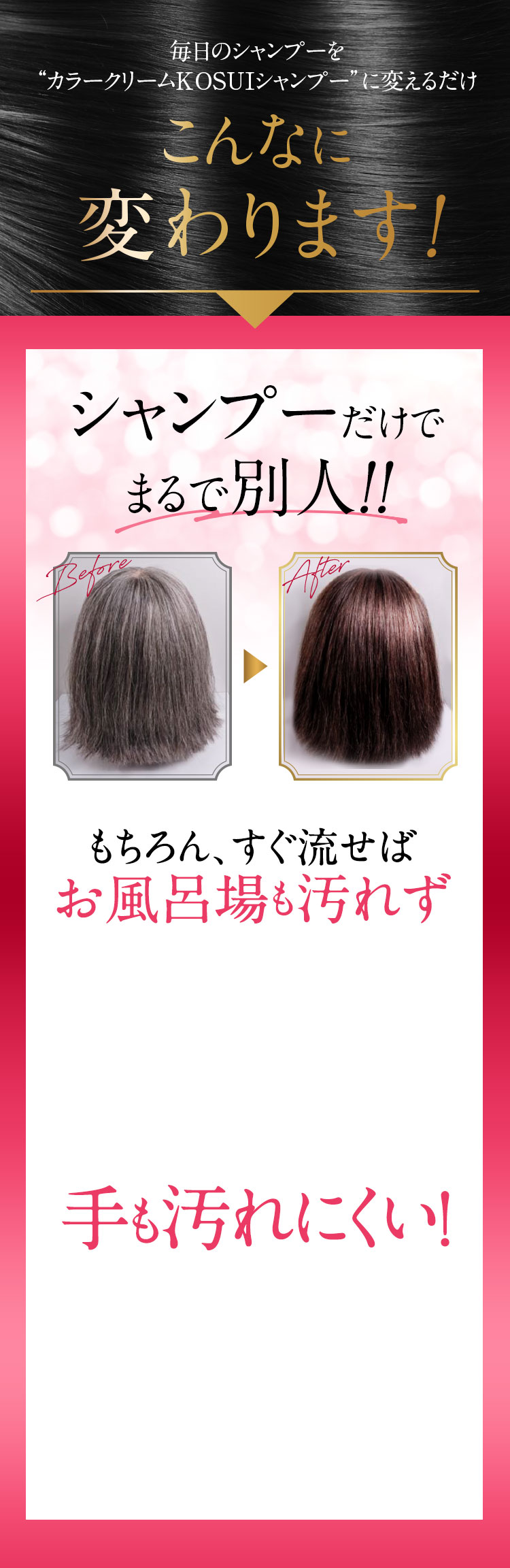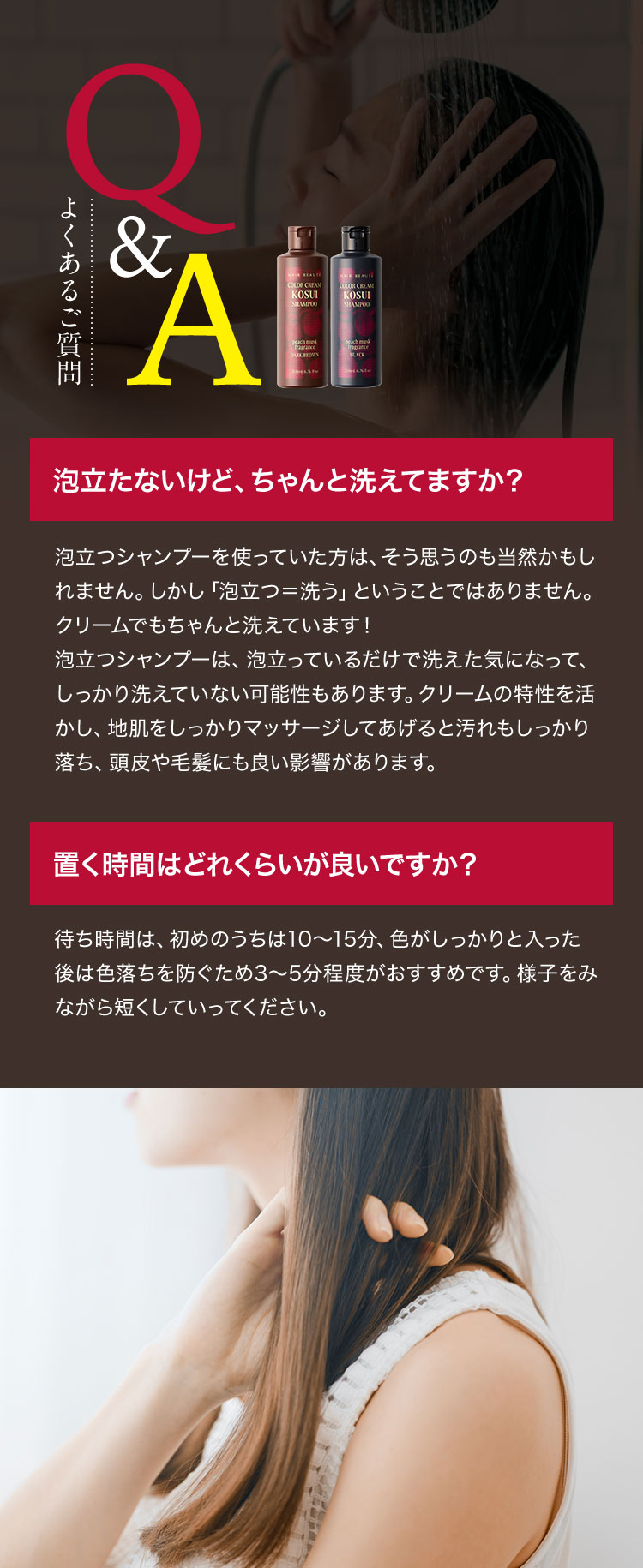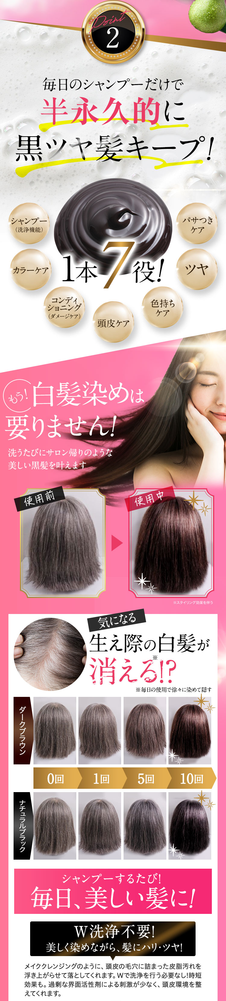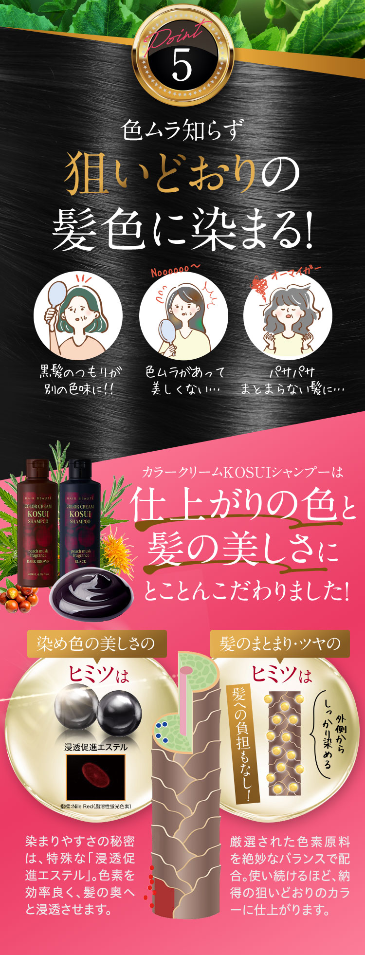 - 水、BG、グリセリン、ソルビトール、尿素、水添ナタネ油アルコール、PPG-1/PEG-1ステアラミン、エチルヘキサン酸セチル、グリシン、リゾレシチン、ミツイシコンブエキス、環状リゾホスファチジン酸Na、加水分解卵黄、 アセチルヘキサペプチド-1、ラリックスエウロパエア木エキス、アセチルチロシン、チャ葉エキス、フィトスフィンゴシン、ザイモモナス培養エキス、ハチミツエキス、卵殻、炭、グリチルリチン酸2K、卵殻膜、アセチルヒアルロン酸Na、 加水分解ヒアルロン酸、ヒアルロン酸ヒドロキシプロピルトリモニウム、加水分解コラーゲン、水溶性コラーゲン、サクシノイルアテロコラーゲン、加水分解シルク、ハチミツ、加水分解コンキオリンタンパク、セイヨウヤブイチゴ葉エキス、 ココイル加水分解コラーゲンK、(加水分解シルク/PGプロピルメチルシランジオール)クロスポリマー、ポリクオタニウム-61、ポリクオタニウム-47、センブリエキス、ビワ葉エキス、オウゴン根エキス、ノイバラ果実エキス、 シャクヤク根エキス、マグワ根皮エキス、トウキ根エキス、クララ根エキス、アカヤジオウ根エキス、オタネニンジン根エキス、オプンチアフィクスインジカ種子油、ハイブリッドサフラワー油、ホホバ種子油、オリーブ果実油、ゴマ油、 アルガニアスピノサ核油、ココイルグルタミン酸TEA、ラウロイルアスパラギン酸Na、ココイルアラニンTEA、イソステアロイル加水分解コラーゲンAMPD、γ−ドコサラクトン、(アクリル酸ブチル/イソプロピルアクリルアミド/ジメタクリル酸PEG-18)クロスポリマー、 加水分解ウールキューティクルタンパク、ココイルアルギニンエチルPCA、マルトデキストリン、デキストラン、トレハロース、スクワラン、セバシン酸ジエチル、イソステアリルアルコール、ミリスチルアルコール、ステアリン酸グリセリル、 ベヘニルアルコール、ラウリン酸ポリグリセリル-10、オレス-20、ベヘントリモニウムメトサルフェート、ポリクオタニウム-10、ステアラミドプロピルジメチルアミン、イソプロパノール、エチルヘキシルグリセリン、ペンチレングリコール、 塩化亜鉛、乳酸、炭酸水素アンモニウム、塩化Na、エタノール、香料、[+/−]塩基性青99、HC青2、塩基性赤76、塩基性茶16、HC黄4、HC黄2、4-ヒドロキシプロピルアミノ-3-ニトロフェノール