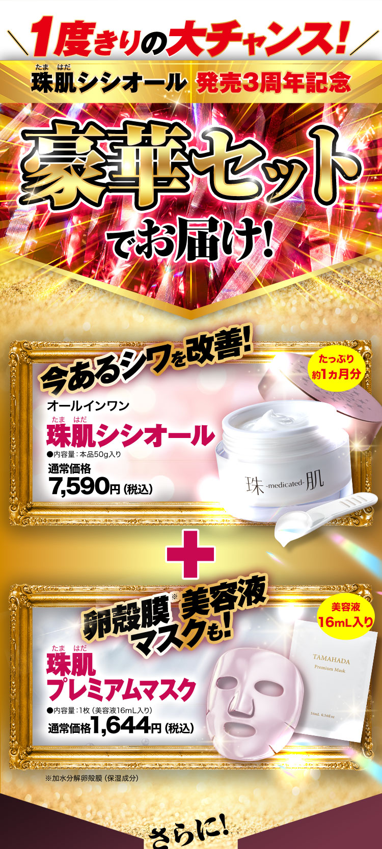 卵黄リゾホスファチジルコリン、酵母エキス(1)、タイムエキス(1)、キイチゴエキス、ユキノシタエキス、オウゴンエキス、クワエキス、クレマティスエキス、サンザシエキス、タイソウエキス、グレープフルーツエキス、リンゴエキス、オレンジ果汁、レモン果汁、ライム果汁、 プルーン酵素分解物、アマチャヅルエキス、ニチレイ・アセロラエキスWB、ビルベリー 葉エキス、ニーム葉エキス、メマツヨイグサ抽出液、油溶性甘草エキス(2)、アルピニ アカツマダイ種子エキス、サクラ葉抽出液、オリーブ葉エキス、スターフルーツ葉エキス、セイヨウオオバコ種子エキス、イエローヒマラヤンラズベリー根エキス、ブリエラスチン、シロキクラゲ多糖体、シラカバエキス、ローズマリーエキス、ローマカミツレエキス、チンピエキス、トウキエキス(1)、ユリエキス、テンチャエキス、イザヨイバラエキス、ユーカリエキス、アルニカエキス、タイムエキス(2)、ステビアエキス、シャクヤクエキス、海藻エキス(1)、ヨクイニンエキス、スイカズラエキス、ブドウ葉エキス、トウヒエキス、ホップエキス、コーヒーエキス、オクラエキス、ボタンエキス、キウイエキス、クロレラエキス、アロエエキス(2)、カッコンエキス、マロニエエキス、セイヨウハッカエキス、 メリッサエキス、ホエイ(2)、加水分解卵殻膜、セイヨウナシ果汁発酵液、ハイビスカス 花発酵液、豆乳発酵液、水溶性コラーゲン液(3)、加水分解コラーゲン液(4)、コラー ゲン・トリペプチドF、ヒアルロン酸ナトリウム(2)、ヒアルロン酸ヒドロキシプロピルトリモニウム、加水分解ヒアルロン酸、リン酸L-アスコルビルマグネシウム、ユズセラミド、パイナップルセラミド、コメヌカスフィンゴ糖脂質、ステアロイルオキシヘプタコサノイルフィトスフィンゴシン、N-ステアロイルジヒドロスフィンゴシン、N-ステアロイルフィ トスフィンゴシン、ヒドロキシステアリルフィトスフィンゴシン、L-アルギニン、L-アスパラ ギン酸、グリシン、L-アラニン、L-セリン、L-バリン、L-プロリン、L-スレオニン、L-イソロイシン、L-ヒスチジン、L-フェニルアラニン、L-グルタミン酸、DL-ピロリドンカルボン酸ナトリウム液、L-ピロリドンカルボン酸、ホホバ油、ラベンダー油、ローマカミツレ油、オレンジ油、ローズマリー油、コメヌカ油、マカデミアナッツ油、天然ビタミンE、シュガースクワラン、メドウフォーム油、濃グリセリン、グリセリン、1,2-ペンタンジオール、1,3-ブチレングリコール、ジグリセリン、トリメチルグリシン、トリポリヒドロキシステアリン酸ジペンタエリスリチル、トリ(カプリル・カプリン酸)グリセリル、2-エチルヘキサン酸セチル、メチルポリシロキサン、カルボキシビニルポリマー、アクリル酸・メタクリル酸アルキル共 重合体、ベヘニルアルコール、モノオレイン酸ポリグリセリル、レシチン、水素添加大豆 リン脂質、フィトステロール、モノミリスチン酸デカグリセリル、親油型モノステアリン酸 グリセリル、セチルリン酸カリウム、クエン酸、クエン酸ナトリウム、乳酸ナトリウム液、水酸化ナトリウム、エタノール、フェノキシエタノール
